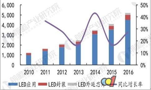 2014 年-2016年,我国LED产业规模由 3507 亿元增长至 5216 亿元,年均复合增长率为 21.96%。其中,2016 年,LED外延芯片市场规模约182亿元,同比增长20.5%;LED封装市场规模748亿元,同比增长21.6%;LED 应用市场规模4286亿元,同比增长 23.2%。